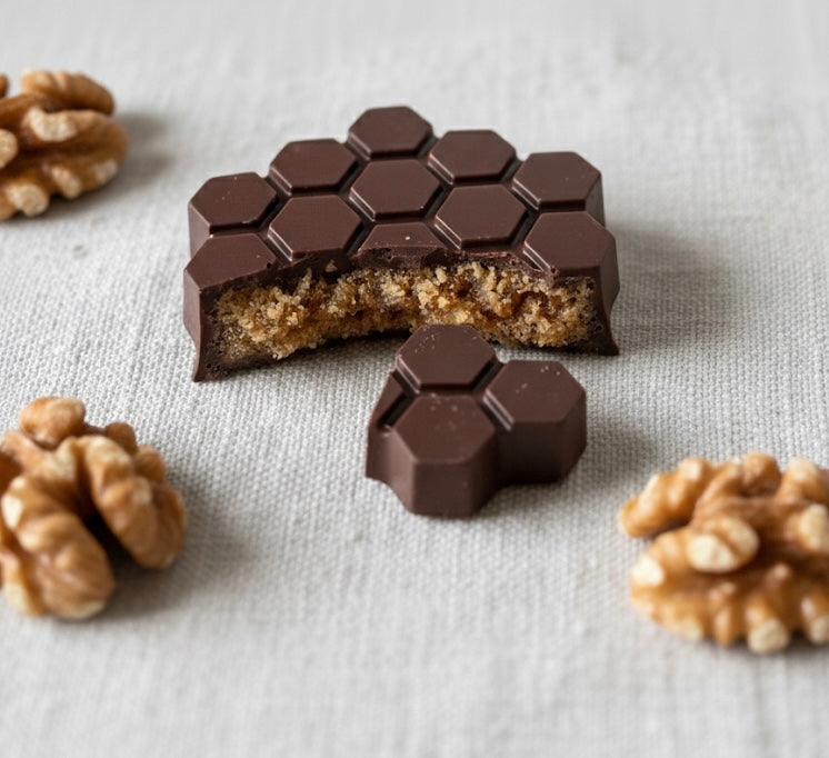 Die cremige Füllung aus frisch gemahlenen Walnüssen & goldenem Honig liegt dabei eingebettet in meiner aromatischer Honigschokolade – ein Zusammenspiel aus zartem Schmelz, feiner Süße & herbstlicher Wärme.